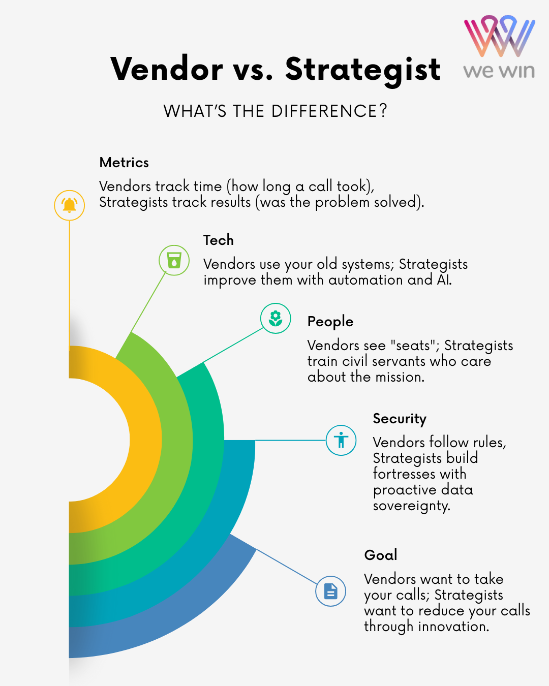 The Difference in Action: Strategists invest in Talent Governance. At We Win, our agents are trained on the "Why" behind the "What." They understand the mission of the agency and the legislative context of the work. This creates an "Ownership Culture" where agents are empowered to solve problems rather than just transfer callers.