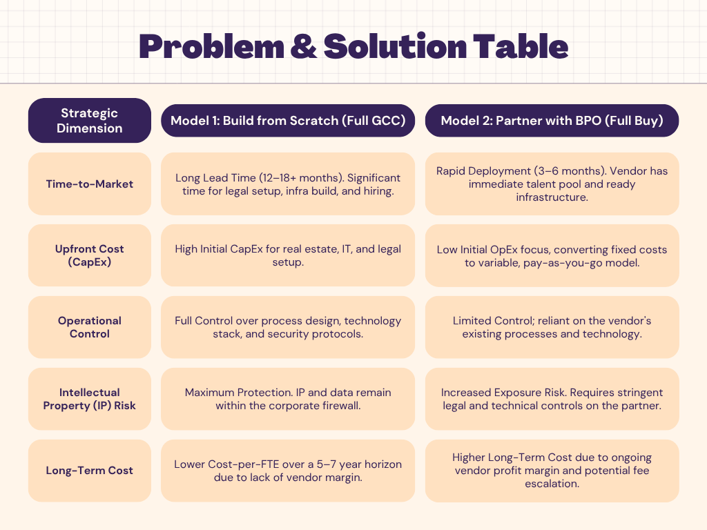 The decision of establishing a Global Capability Center (GCC) is no longer about simple cost arbitrage; it's about speed-to-market, long-term talent strategy, and protecting your intellectual property. This framework will help you navigate the foundational choice: Build from scratch (full GCC) or Partner with a BPO (outsourcing).